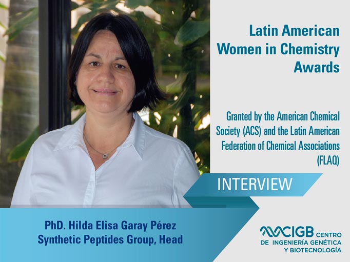 The Doctor in Chemical Sciences Hilda Garay Pérez, Head of the Synthetic Peptides Group at the Center for Genetic Engineering and Biotechnology (CIGB), deserved the Latin American Women in Chemistry Award 2021, awarded by the American Chemical Society (ACS) and the Latin American Federation of Chemical Associations (FLAQ), in the Industrial Leader category, which recognizes women from the chemical, pharmaceutical or biotechnology industries, whose research and innovations have led to discoveries for the benefit of society.